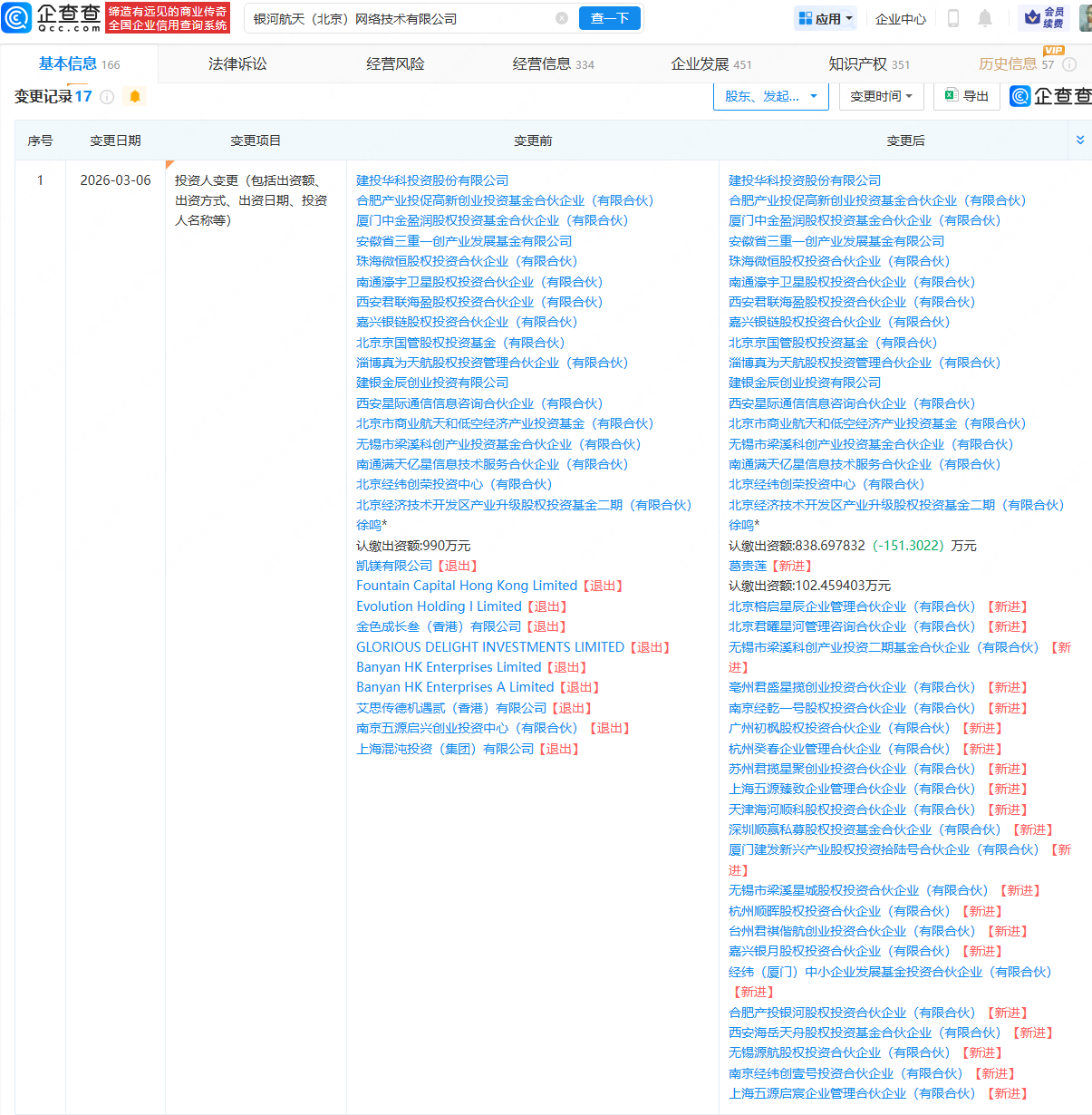 近日,银河航天(北京)网络技术有限公司发生工商变更,原股东上海混沌投资(集团)有限公司、EvolutionHoldingILimited等退出,新增顺为资本关联杭州顺晖股权投资合伙企业(有限合伙)、葛贵莲等为股东,同时,公司主要人员亦发生变更。企查查显示,银河航天(北京)网络技术有限公司成立于2019年6月,法定代表人为徐鸣,公开资料显示,银河航天是卫星互联网解决方案提供商和卫星制造商。