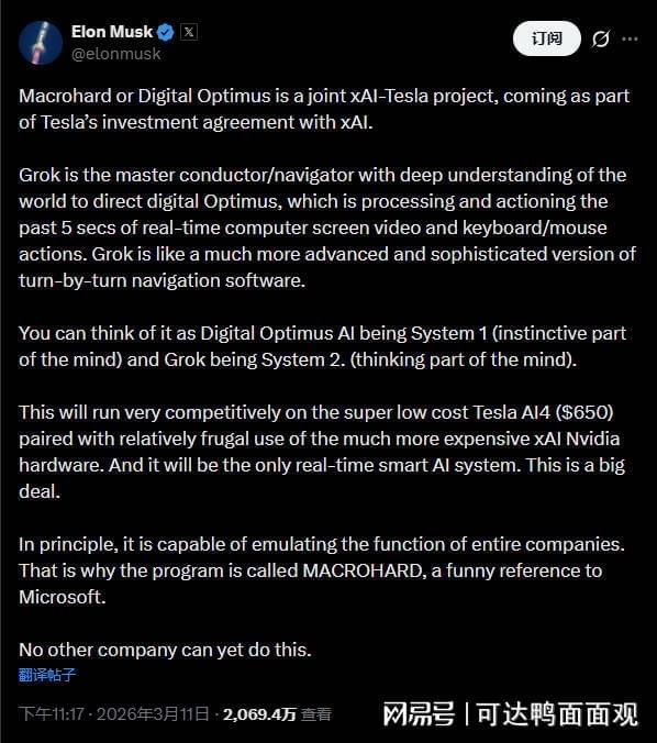 美国当地时间3月11日,特斯拉 CEO 马斯克通过个人社交平台发布重磅爆料,正式确认特斯拉与 xAI 将联合推进名为 Macrohard(又称 Digital Optimus,数字擎天柱)的全新 AI 项目,该项目作为特斯拉与 xAI 投资协议的核心组成部分,标志着两大企业的 AI 资源整合进入实质性落地阶段。